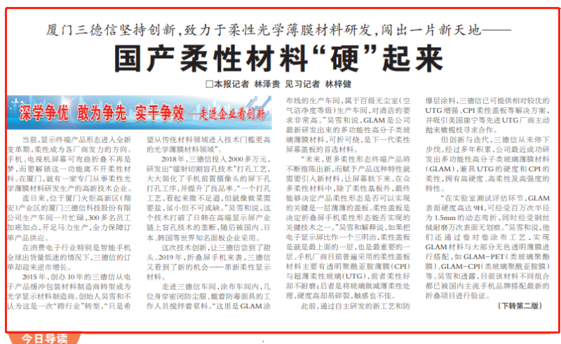 为大力宣传中国制造“隐形冠军”,推广隐形冠军企业的奋斗历程、成功经验和发展模式,引导制造业高质量发展,《福建日报》与【半岛在线官网(中国)】联合陆续推出“隐形冠军”专题报道。以下是专题报道第一篇厦门三德信(协会会员企业)的宣传报道,《国产柔性材料“硬”起来——厦门三德信坚持创新,致力于柔性光学薄膜材料研发,闯出一片新天地》,刊发于今日《福建日报》头版。